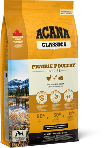 Give your dog the goodness of simple, balanced nutrition with ACANA™ Classics Prairie Poultry. Crafted with a 50/50 blend of quality poultry ingredients and wholesome fruits, grains, and vegetables, this recipe delivers hearty flavour and premium nutrition in every bite. With nutrient-dense ingredients to support immune health, digestion, and a healthy skin and coat, it’s a great everyday choice for keeping your dog happy and healthy.