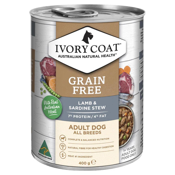 This delicious Lamb & Sardine Stew was developed with veterinarians and animal nutritionists to be the perfect complement to Ivory Coat’s range of nutritious grain free dry dog foods. Feed our stews as toppers to add flavour and variety for fussy companions, or, given that they are complete and balanced, as an everyday food. All our stews are grain free with chunks of meat in a delicious rich gravy, accompanied by a selection of vegetables and superfoods.