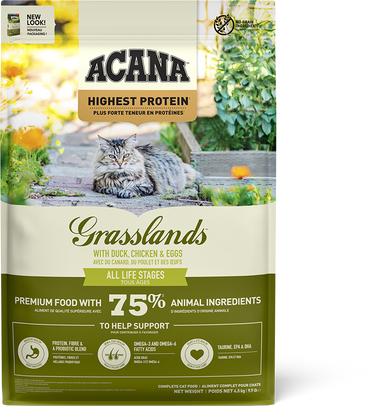 Rich in animal protein, ACANA™ Highest Protein Grasslands satisfies your cat with a delicious medley of duck, free-run poultry, and eggs. Crafted with 75% quality animal ingredients, Grasslands offers a variety of nourishing proteins your cat instinctively craves. This nutrient-dense formula also supports key health benefits including digestive health, healthy skin and coat, and heart and eye health. Give your cat the ultimate protein-rich recipe to help them thrive from the inside out.