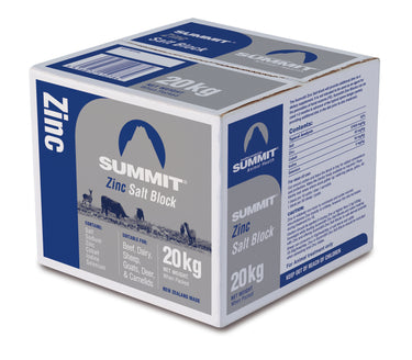 Summit Zinc Salt Block 20kg. Provides additional zinc with essential trace minerals (Co, I, Se) using salt as a carrier. The block is specifically designed for use 1-2 months in advance of the typical FE spore danger period through until the danger period is over, providing additional zinc in the diet prior to zinc treatment. Summit Zinc Salt Block is not a substitute for zinc FE treatment. Additional zinc may also be beneficial for hoof health.
